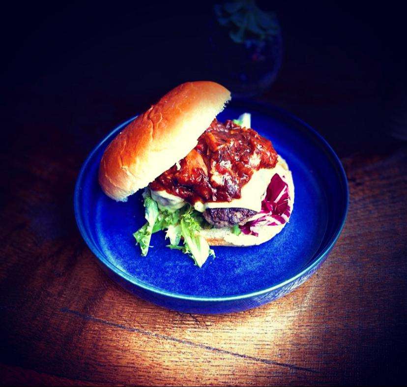Homemade jerk beef burger with crispy salad and blueberry BBQ sauce
